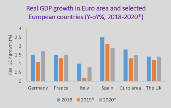 The Euro area has been in an economic downturn since mid-2018 and growth continued to slow substantially in the second half of 2019 due to weakness in the industrial sector as well as increased uncertainty in the global economy. Industrial production has been on a downward trend since 2018, especially in the chemical and automotive sectors. According to the European Central Bank (ECB), growth in the Euro area is set to decline from 1.8% in 2018 to 1.1% in 2019 and 1.2% in 2020. In the last quarter of 2019, GDP growth fell to 0.1% in the Euro area – down from 0.3% in July-September – as the manufacturing sector dropped further below its longer-term average level. In general, growth rates have been marked down for many economies in the region, of which Germany – the largest economy in the Euro area – continues to suffer from weak industrial production and subdued foreign demand as well as soft private consumption. In 2019, Germany’s GDP growth amounted to 0.6%, being the slowest rate since 2013. According to Eurostat, the country’s industrial output in November 2019 was down by 4% compared to the previous year. The slowdown – particularly in Germany’s auto industry – has already had a negative influence on its neighboring countries, which produce parts or finished products for German brands.