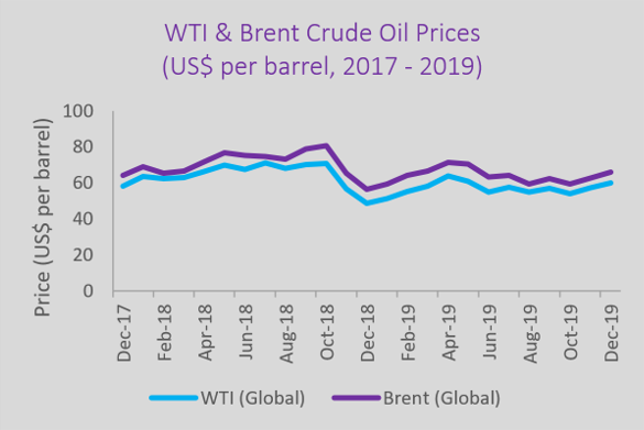In 2019, the price of Brent crude oil – the international benchmark – averaged US$64 per barrel (bbl), being US$7 bbl lower than in 2018. This was mainly due to increases in the US’ petroleum production, which put downward pressure on global crude oil prices. According to several industry experts, the US’ production increases likely limited the effect on oil prices from the attack on key energy installations in Saudi Arabia in September 2019, production cut announcements from OPEC and the US’ sanctions on Venezuela and Iran (limiting crude oil exports from these countries). Accordingly, throughout 2019, global crude oil prices traded within a relatively narrow price range compared with recent years; West Texas Intermediate (WTI) crude oil was between US$49-71, while Brent crude oil was $56-80 per barrel. The US Energy Information Administration (EIA) estimates that crude oil prices will continue to decline in 2020. Brent spot prices are projected to average US$61 per barrel in 2020 – slightly down from the US$64 per barrel in 2019 – due to rising global oil inventories, which continue to accumulate as a result of strong oil production in the US, Canada and Brazil, lower demand for oil globally and weak compliance by some OPEC+ countries (e.g. Russia). WTI prices, in turn, will average US$5.50 per barrel less than Brent prices in 2020, according to data from the EIA. Even though crude oil prices temporarily increased in January 2020 following the US military operations in Iraq and Iran, industry experts project global oversupply to keep the benchmark price at a lower level until 2021. Overall, energy prices – including also natural gas and coal – are expected to decline in 2020, reflecting strong inventory injections and a decline in the US’ natural gas demand, according to the EIA’s estimates. In February 2020, representatives of OPEC and its allies (e.g. Russia) set up an urgent assembly after global crude oil prices had fallen 20% since their peak in January – hitting their lowest levels in a year. According to Bloomberg, China’s 20% drop in its daily crude oil consumption accounted for the UK and Italy’s oil need combined.  The sudden drop was estimated to be caused by the outbreak of the new coronavirus in China coupled with the extended Lunar New Year holiday, travel restrictions and prolonged shutdowns of factories, offices and shops. As a result, China – the world’s biggest importer of crude oil consuming about 14 million barrels per day – has decreased its oil purchases since the virus outbreak. Moreover, the virus has had an impact on major international airlines’ demand for jet fuel after they have suspended flights to China.