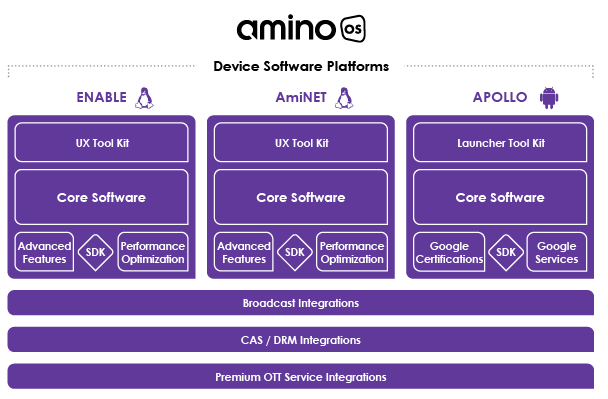 AminoOS is built on over 20 years of focused IP entertainment delivery excellence. With proven performance in over 10 million devices – and an unrivaled reputation for reliability – AminoOS supports both Linux and Android with integrations to a broad and deep industry ecosystem.
