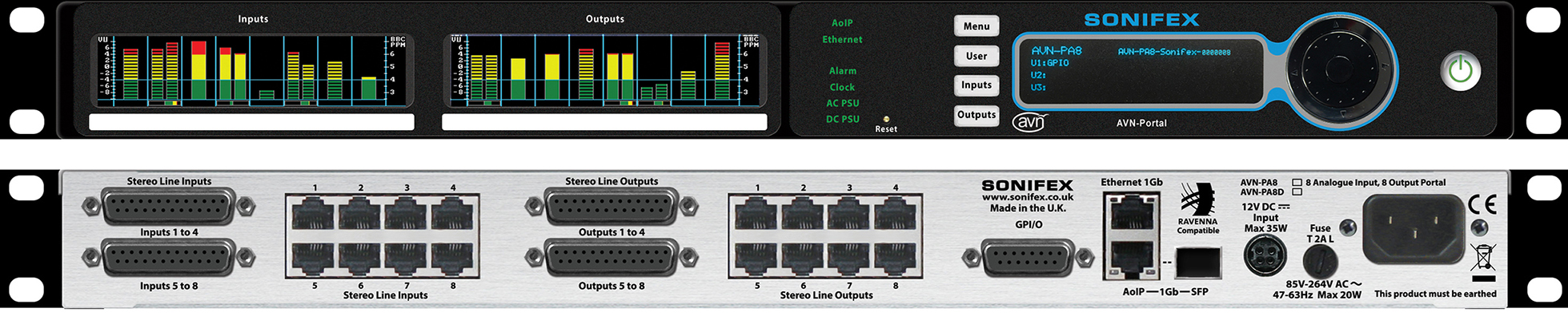 The AVN-Portal series is a group of three powerful audio mix engine interfaces (AVN-PA8, AVN-PD8 & AVN-PM8) capable of audio routing, metering and equalisation. They have both physical audio I/O and AES67 stream I/O and can mix and route freely from any input to any output, useful for a multitude of applications.