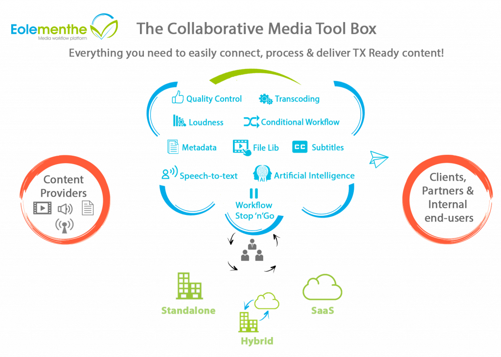 Eolementhe© is a file-based solution offering into a very easy-to-use single interface, multi-providers tools to cover several media workflows. Eolementhe© combines automated processes and manual interventions when it’s necessary. Collaborative and agile work with your partners made easy!