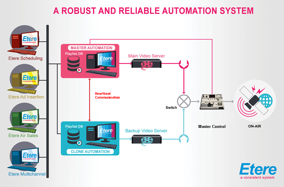 ■ Etere Automation is able to offer different levels of fault tolerance, with Backup Mode, Master/Clone Mode, and Disaster Recovery Mode with a distributed architecture that provides high redundancy for system failure