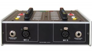MonitoringThere are four inputs for external sources, and one sidetone pot of their own voice and another pot for monitoring the other commentator. These are available independently to each commentator on individual pots, so each can adjust the inputs for their own preference of mix level. There are two 6.35mm headphone sockets – 1 for each commentator. A 7 segment LED PPM meter displays level.