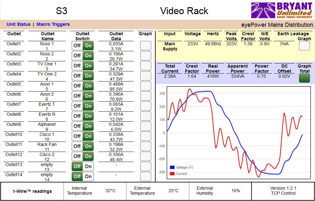 The 14 way eyePower Mains Distribution Unit (MDU) from Bryant Unlimited offers unrivalled measurement and control of mains power distribution in technical environments. Real time data extends far beyond voltage and current, delivering invaluable safety, reliability and cost management data. eyePower users improve system uptime and can demonstrate their commitment to a safe installation.