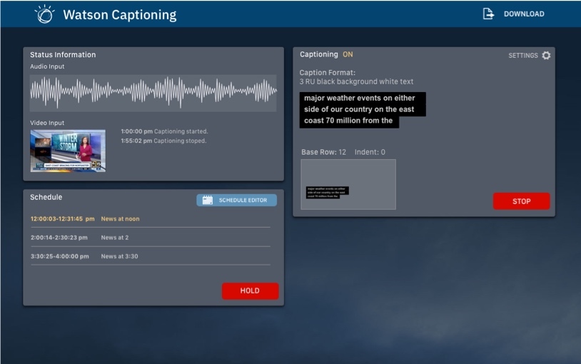 IBM Watson Captioning is a solution that generates automatic closed captions for video using artificial intelligence. It automates the previously time consuming and costly process of creating captions for both on-demand and live video content, empowering content owners and broadcasters to quickly generate captions.