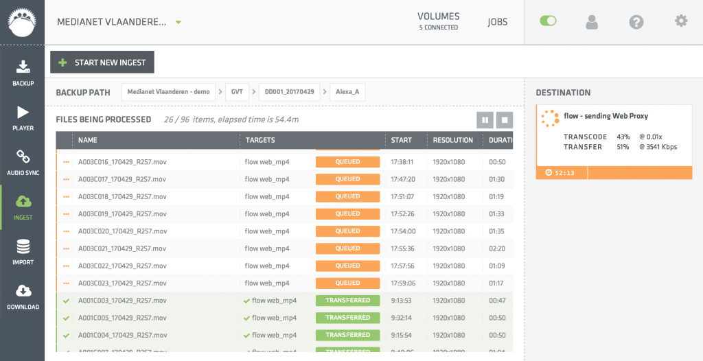 Limecraft Edge our signature application to take care of backup (offload), audio synchronisation, colour grading, encoding of browse and edit proxies, as well as ingest into one or more locations. It processes thousands of files at the same time. It handles all common consumer and professional file formats. It is extremely reliable and it will make sure you’ll never loose a single shot.