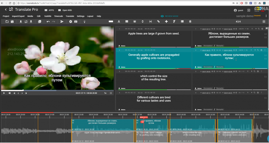 Create and edit captions and subtitles in any language online, using simple and intuitive web interface. State-of-the-art tools allow frame-accurate text timing with advanced timeline, video grid for precise caption positioning on the screen, audio waveform and scene-change detection for accurate subtitle spotting.