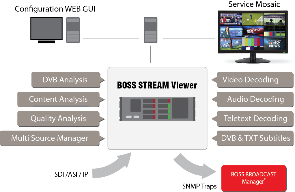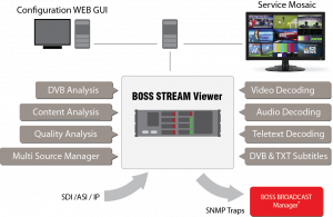 This scalable system can provide real-time analysis of DVB, content and quality level (blocking and blurring), while decoding and displaying video, audio, teletext and subtitle services. The entire alarming thresholds are configurable and the system is capable of notifying any 3rd party monitoring or management system, such as the Dimetis BOSS BROADCAST ManagerTM, with alerts, problem or quality conditions. Application areas include DVB analysis, content and quality analysis, management of multiple sources, video and audio decoding, teletext decoding and DBV/TXT subtitles. The Dimetis BOSS STREAM Viewer comes “out of the box” and can easily be integrated in broadcaster’s environment as it operates on standard server hardware. With the combination of SDI and DVB signals, BOSS STREAM Viewer is perfect for comparing incoming and outgoing signals on one single screen.