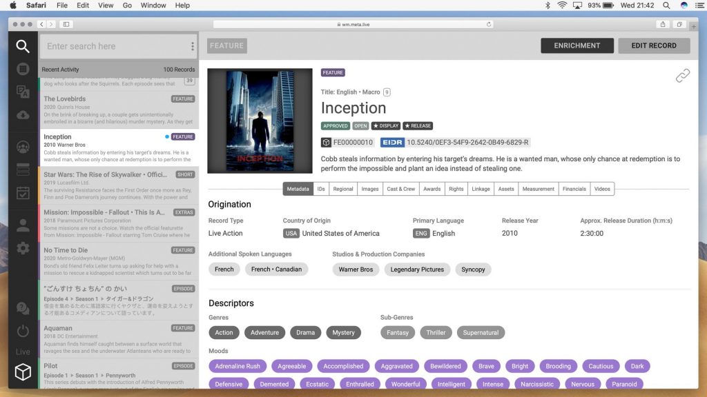 ■Complete VOD management, including metadata creation for VOD, automated QC and transcoding processes, delivery of video, images, and trailers to streaming platforms, MD5 checksum capabilities to preserve data integrity after file movements and management of asset versioning with automatic hierarchical assets structure that makes it easy to retrieve, share and distribute content