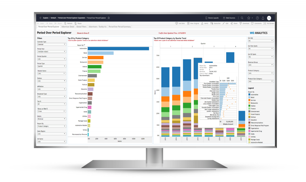 WO Analytics provides business intelligence specific to the local TV and radio industries, consolidating all relevant data from both WideOrbit and third-party systems within a single analytics platform. A unified view across channels, markets, and platforms makes it simple for any user to analyze business performance, spot inefficiencies, and pinpoint new revenue opportunities.