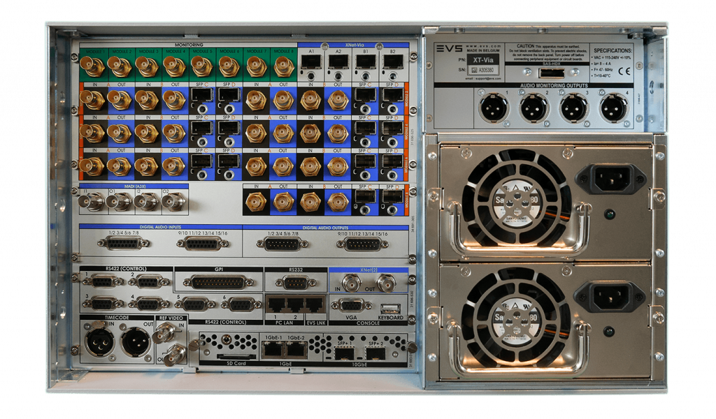 In addition to EVS Loop Recording technology, on-board XNet SDTI support and XNet-VIA IP networking, XT-VIA provides support of SuperMotion cameras and native XAVC-4K Intra encoding and decoding for live editing, slowmotion replays and multi-channel playback with server-to-server transfer options.