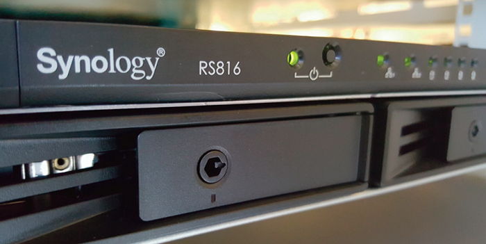 The installation also includes switching for SDI (Blackmagic Design) and ethernet (HP). Shared content storage is on a Synology RS816 NAS, providing capacity for 12TB. The rack also includes a firewall from Sonicwall to protect the installation from online threats, and a long-term compliance recorder to meet the legal requirement to review the past six months of broadcasting on each channel.
