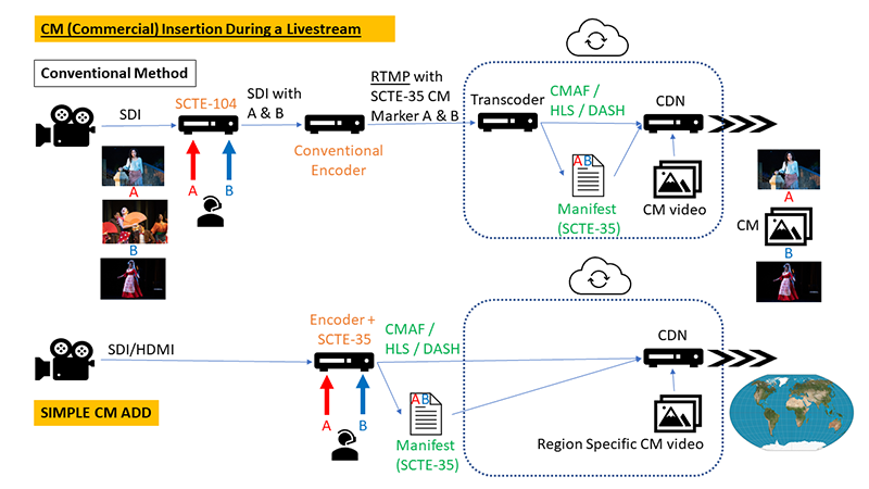 While conventional methods require costly equipment (e.g. SCTE-104) or cloud processes (e.g. transcoding), new methods such as SIMPLE CM ADD do not.