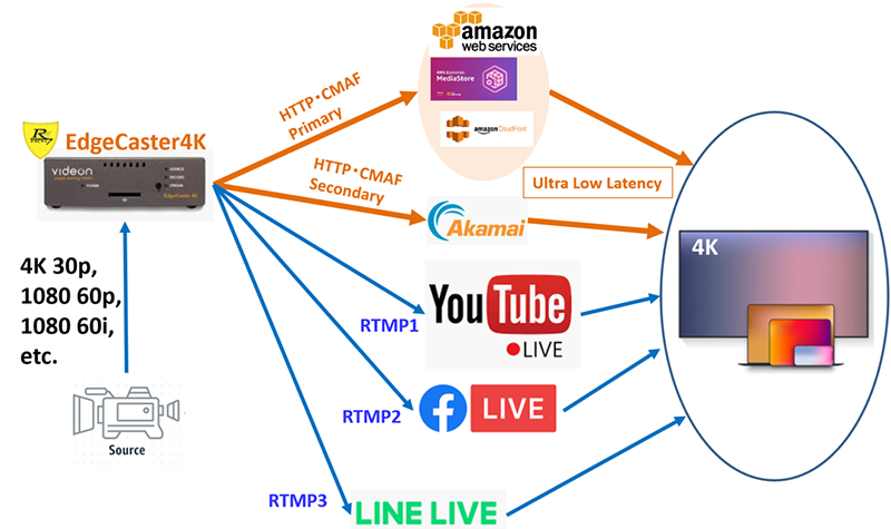 To fulfil these requirements, we came to rely on Videon’s “EdgeCaster.” It is powered by a Qualcomm SoC that was originally designed for portable devices, consumes little power (< 7w), and operates without a fan. It is small (38.1mm×127mm×107.5mm) and light (450g), delivers multiple HTTP and RTMP streams simultaneously, and supports 4K.