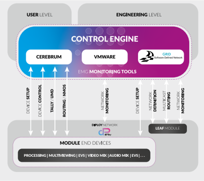 Speaking for EMG, CTO Bevan Gibson observed: “The key benefit of IP technology is that it allows the creation scalable, flexible systems which are easily capable of remote and distributed production workflows. The idea with the modular nature is that it’s fast to install, fast to prepare, very flexible in what it can do — and because the connectivity between modules is IP it’s far simpler than legacy infrastructure based on SDI. Whether it’s distributed locally across a couple of kilometres, or distributed to 5,000 kilometres away, the diPloy system utilising GRID, is designed to handle both operations.