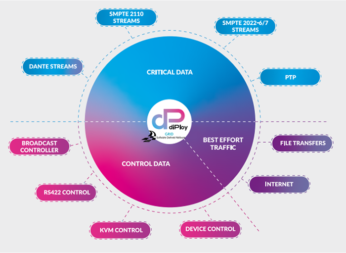 diPloy’s control software is designed around a Northbound and Southbound system. The Northbound Control is based on familiar broadcast control software, interfacing with the Southbound Controller that runs hidden in the background, communicating with switches and routers. This is powered by GRID; guiding the path for all data-streams to facilitate the above-mentioned predictable low latency data-streams which are crucial to the ability to engage in distributed live production.