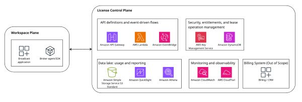 The license control plane provides centralized management of entitlements and policies, ensuring consistent license governance. It includes comprehensive usage metering and analytics capabilities for monitoring and optimization. Security and authentication services are integrated at the core level. A common API gateway facilitates uniform access across all licensing operations.