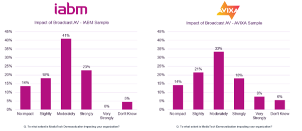 Survey participants were asked succinctly, “to what extent is Broadcast AV impacting your organization”. Below a comparison can be made between responses given by IABM’s community and AVIXA’s. While an almost identical proportion of respondents in each sample respectively (80-81%) recognised an impact on their organization, there was variance in the extent to which this was felt.