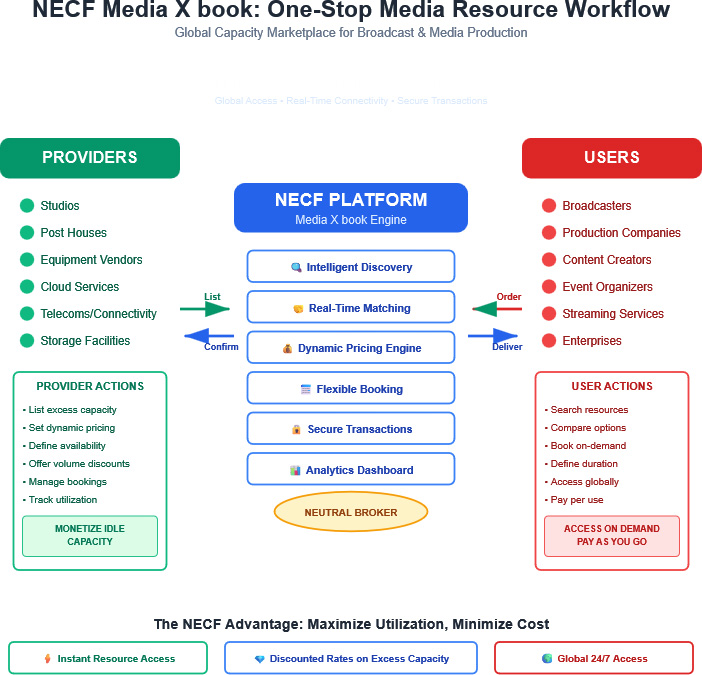 Founded by broadcast executives, NECF launched a global e-commerce marketplace using patented AI systems transforming how media production resources are organized, traded, and monetized worldwide. Its flagship platform, MediaXBook, is the world’s first media production exchange, an e-commerce marketplace connecting broadcasters, studios, and creators worldwide with under-utilized production capacity. By matching supply and demand in real time, NECF enables media companies and video producers to save time, reduce costs, and expand creative possibilities while providing vendors with better utilization rates and new opportunities.