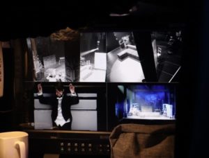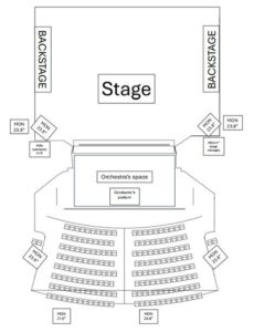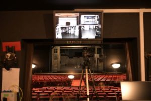 - Detailed monitor placement within the theatre, illustrating real-time feed distribution to performers and technical teams.